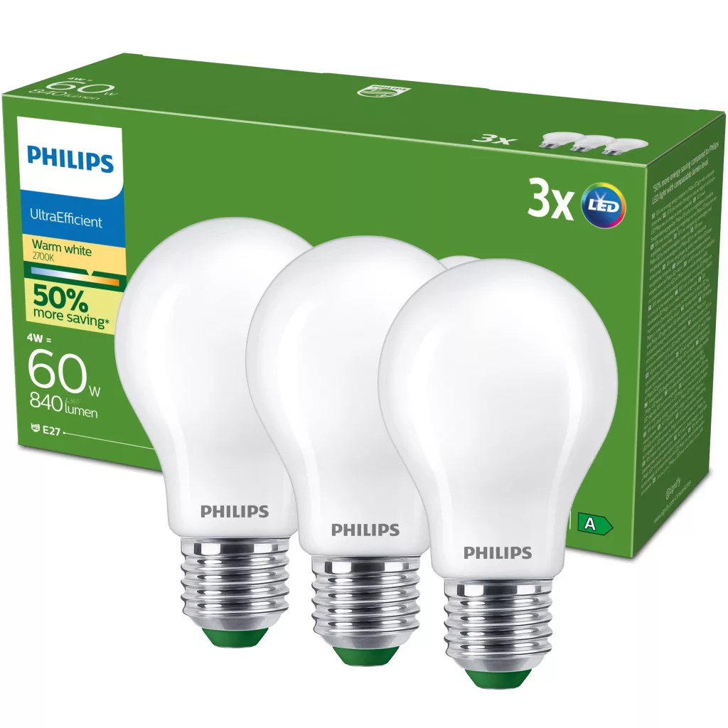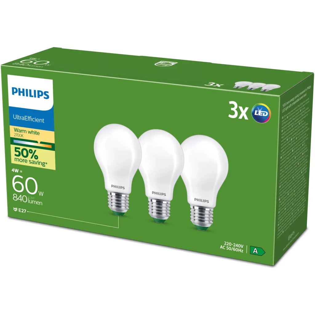 3x LED izzó E27 A60 4W = 60W 840lm 210lm/W 2700K Meleg 300° Tejes A OSZTÁLYÚ Ultrahatékony Philips