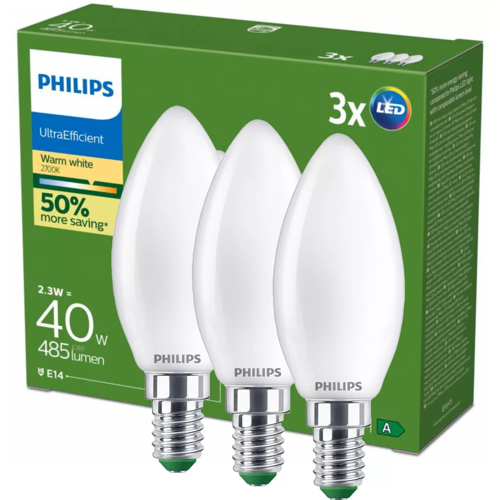 3x LED izzó E14 gyertya B35 2.3W = 40W 485lm 210lm/W 2700K Meleg 300° A osztályú UltraEfficient Philips