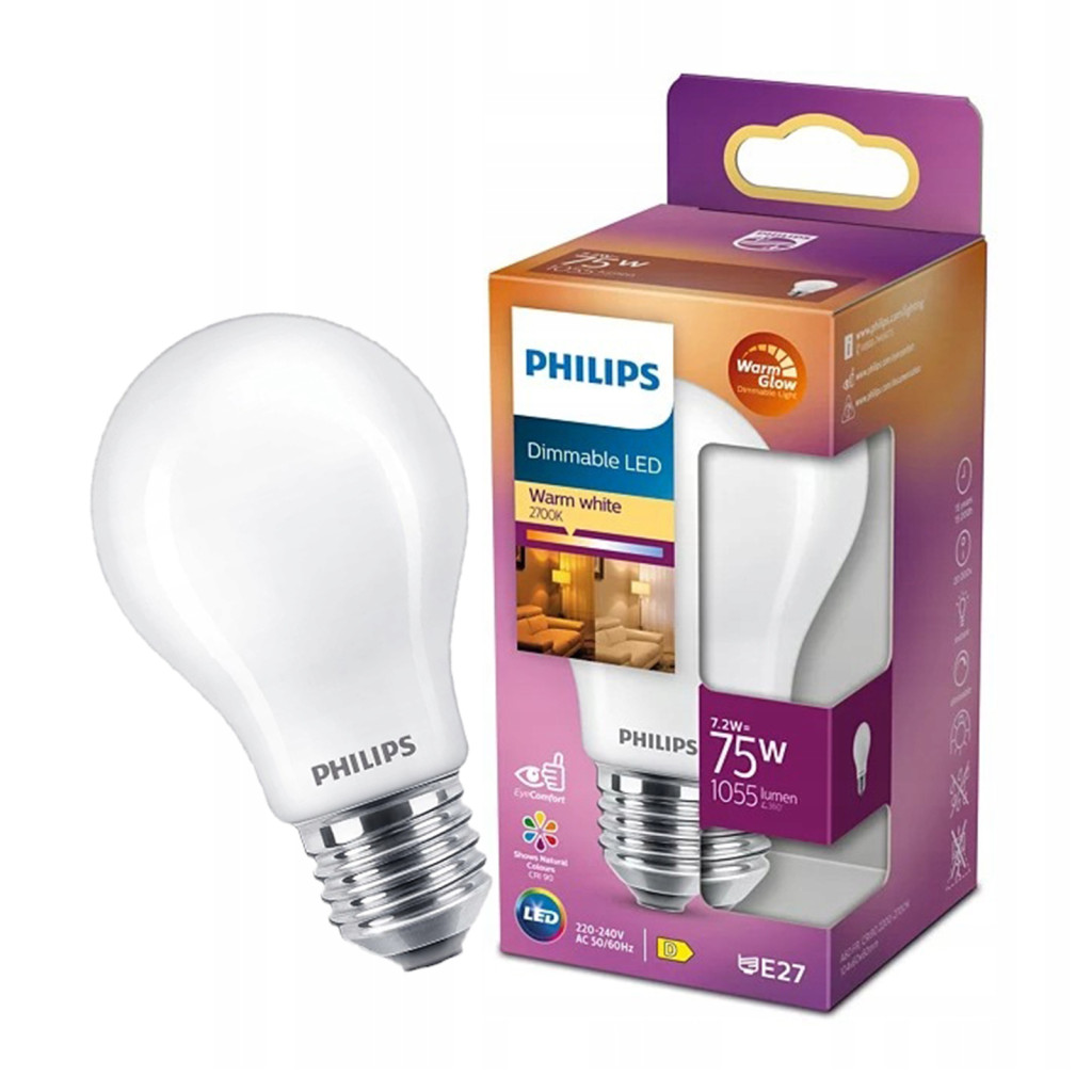 LED izzó E27 A60 7,2W = 75W 1055lm 2700 meleg izzószál tejes PHILIPS szabályozható