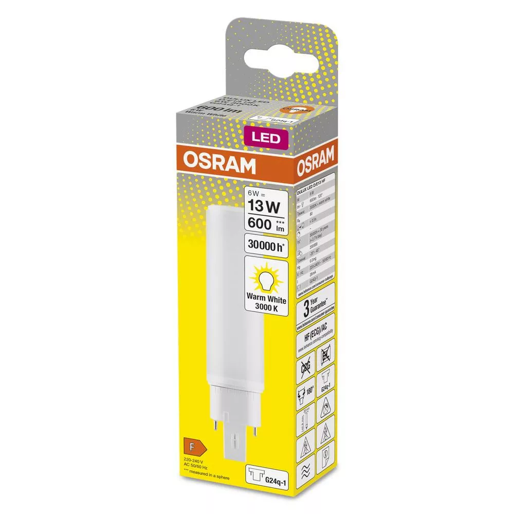 LED fénycső, egyoldalas, G24q-1, 6W = 13W, 600lm, 3000K, meleg, 120°, DULUX LED D/E HF és AC, Osram